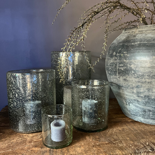Het windlicht is vervaardigd uit grof geblazen glas met een robuuste afwerking van steenslag, waardoor elk stuk uniek is en een natuurlijke, ongepolijste look heeft. - Geschikt voor verschillende ruimtes:
