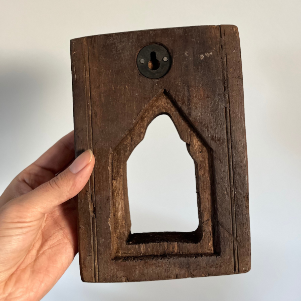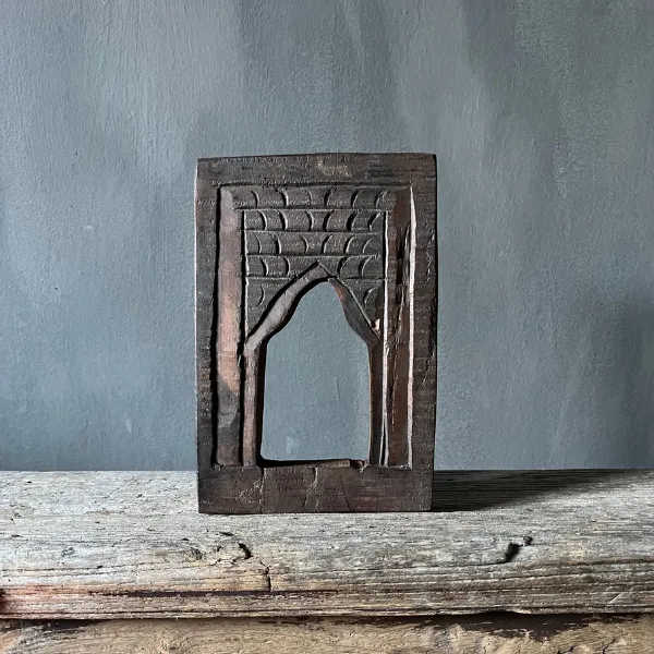 Een uniek stuk dat direct sfeer en geschiedenis in huis brengt. Deze houten wanddecoratie is met de hand uitgesneden en toont een prachtige boogvorm met subtiele patronen erboven. De donkere, doorleefde houttint geeft een rijke, warme uitstraling die perfect past binnen een sober en landelijk interieur.