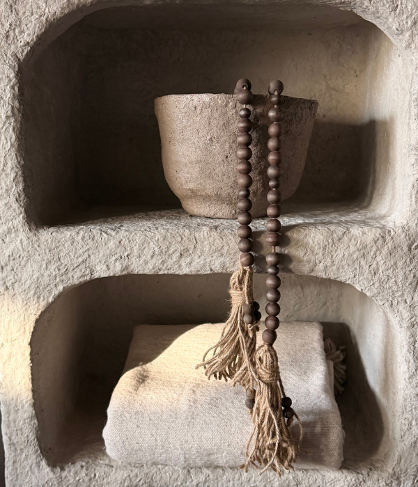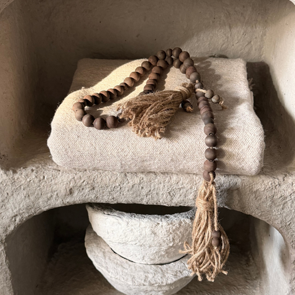 Decoratieve houten kralen ketting met jute klosjes. Perfect voor het stylen van je salontafel of dressoir kast.